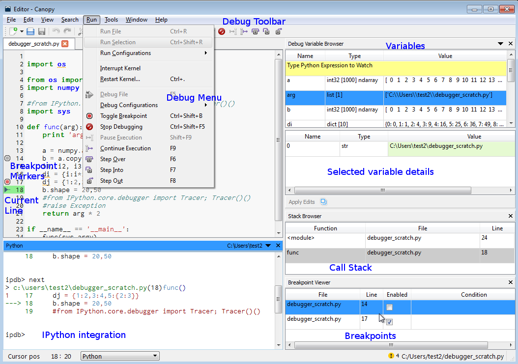 The Canopy editor includes a graphical interactive debugger for Python programs. Using the debugger, you can run a script, pause its execution at specified breakpoints, and step through the code line by line. Whenever the program is paused, you can inspect variables and evaluate arbitrary expressions. Canopy’s debugger is tightly integrated with IPython’s debugger.